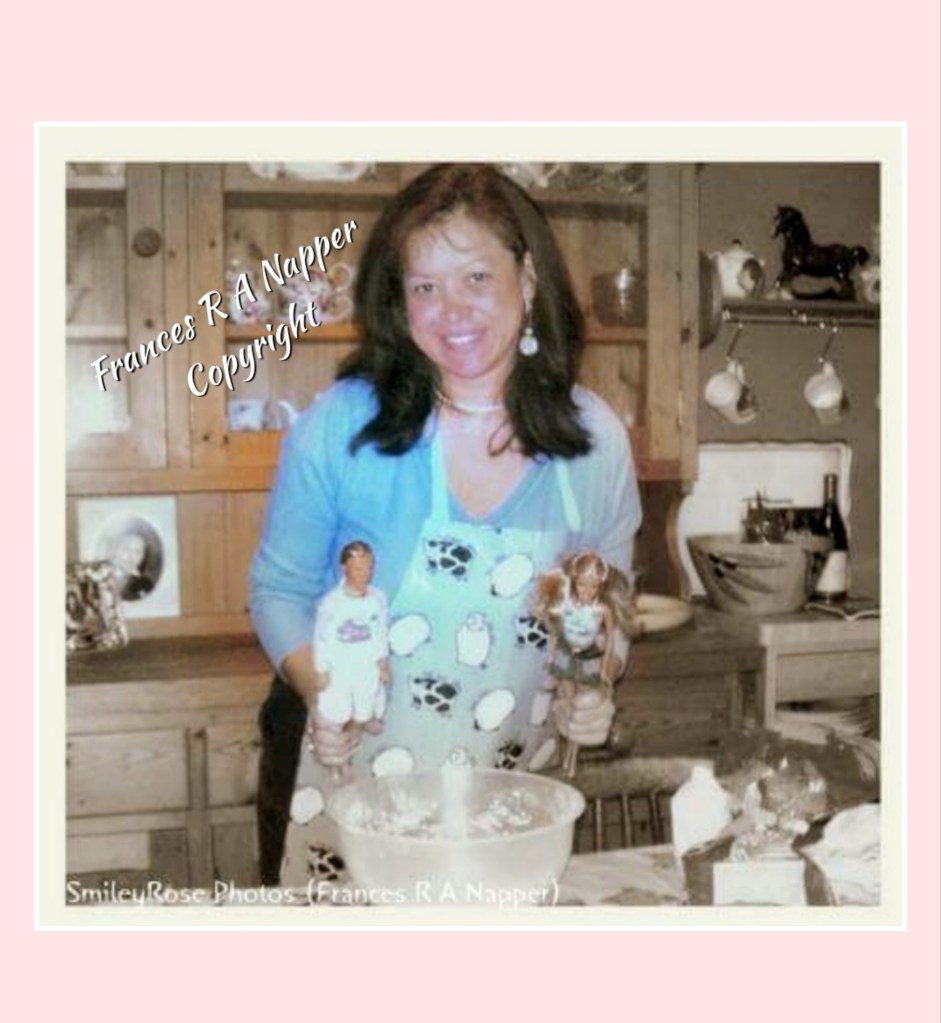Me, as a young mother, doing a cookery demonstration for my children, with Barbie and Ken 😀